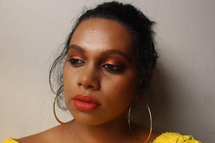 Apply an orange shade in the crease as transition . A lighter orange shade in the socket and a deep red on the eyelids . I then went on with a copper shimmer on the lid . I deepened up the edges of my eyes with a dark brown shadow . I finished off the look with some eyeliner and mascara . Hope you guys give this a go .